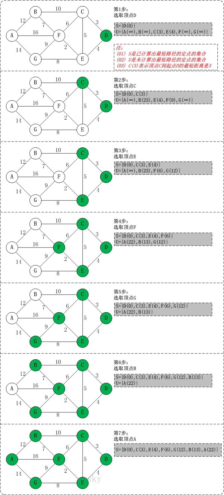 初始时,S中只有起点s;U中是除s之外的顶点,并且U中顶点的路径是”起点s到该顶点的路径”。然后,从U中找出路径最短的顶点,并将其加入到S中;接着,更新U中的顶点和顶点对应的路径。 然后,再从U中找出路径最短的顶点,并将其加入到S中;接着,更新U中的顶点和顶点对应的路径。 … 重复该操作,直到遍历完所有顶点。