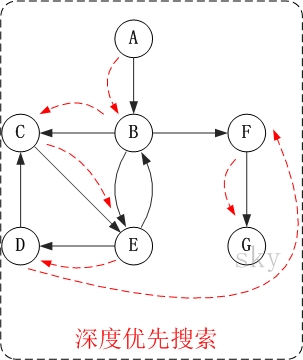 在访问了B之后,接下来应该访问的是B的出边的另一个顶点,即顶点C,E,F。在本文实现的图中,顶点ABCDEFG按照顺序存储,因此先访问C。